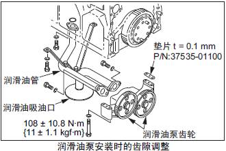潤滑油泵安裝在曲軸箱上后,測量曲軸齒輪和潤滑油泵齒輪的齒隙。齒隙不符標準值時,在潤滑油泵安裝部位插入墊片進行調(diào)整。
