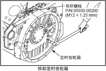 (2) 將三菱S12柴油發(fā)動(dòng)機(jī)正時(shí)齒輪箱吊住并向外移動(dòng)至脫出定位銷(xiāo)后拆下。