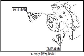 (2) 安裝三菱R16柴油發(fā)動機(jī)三菱R16柴油發(fā)動機(jī)缸體和齒輪箱的水管連接套,注意不要損傷O形圈。