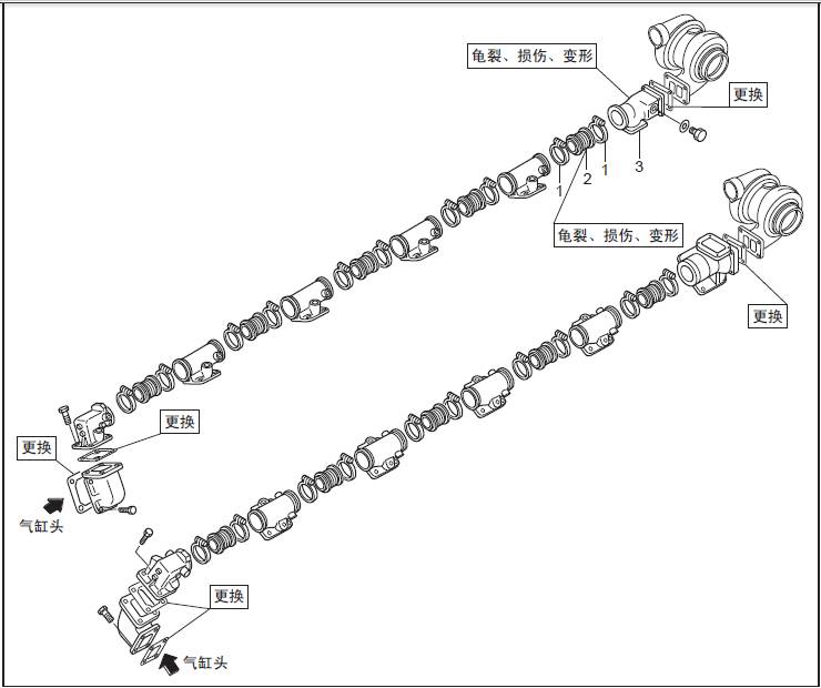 1. 三菱R16柴油發(fā)動(dòng)機(jī)進(jìn)排氣系統(tǒng)的拆卸、檢測(cè)