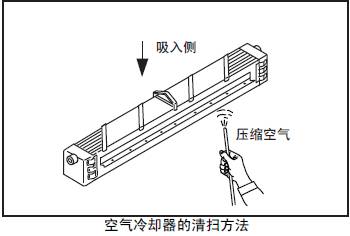 用壓縮空氣(0.29 ~ 0.49MPa{3 ~ 5 kgf/cm2} 以下) 沿通常的空氣流向的相反方向吹入,吹除粘著物同時(shí)檢查有無(wú)腐蝕或龜裂。