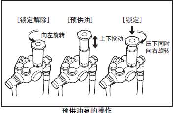 (3) 從放氣塞內(nèi)排出的燃油不含有氣泡時(shí)旋緊塞頭,但在旋緊最后的1個(gè)放氣塞前,先將預(yù)供油油泵的端蓋壓下向右旋回至原狀鎖定。