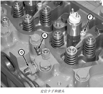 2. 安裝噴油嘴,將噴油嘴的固定卡子(D) 固定在缸蓋上。安裝后,噴油嘴的的進(jìn)油口 (A) 一定要對著供油管 (E)。