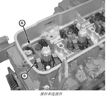 重要提示: John Deere約翰迪爾強(qiáng)鹿柴油發(fā)動(dòng)機(jī)或缸蓋大修期間,每次拆下支座后,都要更換 O 形密封環(huán) (B) 和搖臂供油O 形環(huán) (A)。