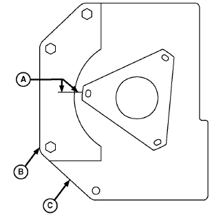 1. 如圖所示,將 DFRG5 鋁模板(B) 放到原前板(C)上。(詳細(xì)制作說(shuō)明,參見(jiàn)第 05 部分第 190 章“經(jīng)銷商制造工具”。)安裝和擰緊三個(gè) 3/8-16 帶帽螺釘。