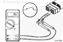從康明斯電子控制模塊 (ECM) 上斷開原始設(shè)備制造商 (OEM) 線束接頭。將一根測試導(dǎo)線插入 OEM 線束接頭上的開關(guān)回路觸針,然后將鱷魚夾連接到萬用表表筆上。將另一根導(dǎo)線插入 OEM 線束接頭上的風(fēng)扇控制開關(guān)信號觸針,然后將鱷魚夾連接到萬用表另一個表筆上。
