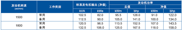 上表所有額定功率數(shù)據(jù)均為配備標(biāo)準(zhǔn)尺寸風(fēng)扃與驅(qū)動(dòng)器比率的發(fā)動(dòng)機(jī),ISO/TR 14396/IS0 8528條件下操作時(shí)數(shù)據(jù)。有關(guān)上述條件以外操作的數(shù)據(jù)請(qǐng)咨詢珀金斯公司,Perkins提供的性能公差為±5%。電氣參數(shù)假設(shè)功率因數(shù)為0.8與發(fā)動(dòng)機(jī)效率90%。