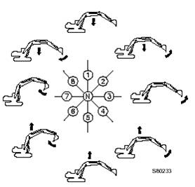 此款挖掘機(jī)具有多功能,可以安裝多種專用前部工作裝置,完成各類作業(yè)。下面只對(duì)最簡(jiǎn)單的操作進(jìn)行說明。