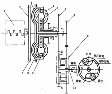 當(dāng)裝載機(jī)高速、輕載運(yùn)行時(shí),雖然一、一級(jí)渦輪的動(dòng)力輸出路線相同,但是,由于內(nèi)環(huán)凸輪的轉(zhuǎn)速高于外環(huán)齒輪,外環(huán)齒輪處于空轉(zhuǎn)狀態(tài)。此時(shí),只有二級(jí)渦輪輸出動(dòng)力,一級(jí)渦輪處于空轉(zhuǎn)狀態(tài),對(duì)外無(wú)動(dòng)力輸出。