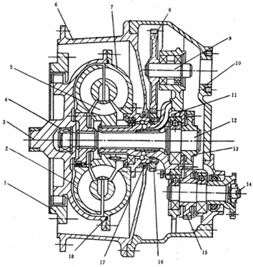 泵輪通過(guò)兩排球軸承16支承在導(dǎo)輪座上。裝配時(shí),先將分動(dòng)齒輪支承在導(dǎo)輪座的兩排軸承上,再用螺栓將泵輪與分動(dòng)齒輪13相連。