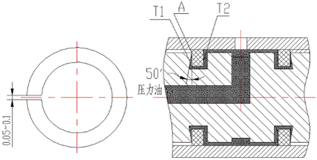密封環(huán)12和14的安裝好壞和使用中的摩擦將影響操縱油的密封情況,從而影響離合器的工作,應(yīng)此對(duì)密封環(huán)的安裝要予以足夠的重視。見(jiàn)密封示意圖。在軸上的槽中,靠外側(cè)一面有50‘的斜角,會(huì)使兩側(cè)的T1及T2面產(chǎn)生壓力差,T2面壓力稍大于T1面,在壓力差的作用下,緊壓在A點(diǎn)附近的一個(gè)小環(huán)形面上,達(dá)到密封的目的,并在A點(diǎn)附近產(chǎn)生相對(duì)轉(zhuǎn)動(dòng)與摩擦。密封環(huán)的外圓因受密封環(huán)的張緊力,而壓在套的內(nèi)圓面上。