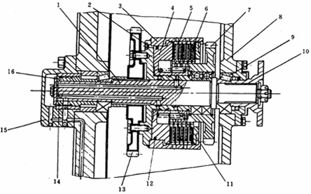 液壓離合器的離合器殼3和齒輪13用螺釘固裝在一起,齒輪13又通過(guò)內(nèi)花鍵與輸入軸連接,構(gòu)成離合器的主動(dòng)部分。離合器部分則由活塞4、主動(dòng)(外)摩擦片5、從動(dòng)(內(nèi))摩擦片6、回位彈簧11、外端蓋以及檔圈等組成。離合器中的主動(dòng)摩擦片通過(guò)外花鍵與離合器的殼體連接,從動(dòng)摩擦片則通過(guò)內(nèi)花鍵與從動(dòng)齒輪連接。從動(dòng)齒輪通過(guò)軸承支承在輸入軸上,并可相對(duì)于輸入軸轉(zhuǎn)動(dòng)。