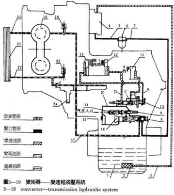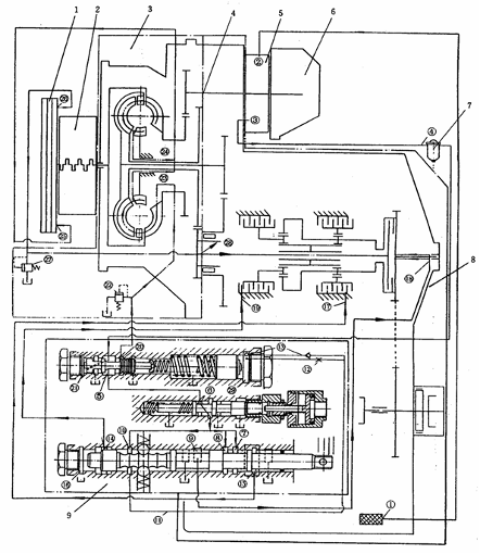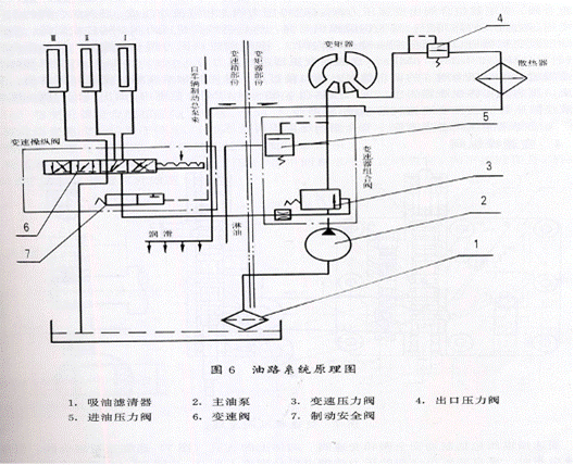 液力傳動(dòng)油經(jīng)變速泵輸出,經(jīng)濾油器過(guò)濾后供給變速操縱閥(或減壓閥)。工作油液首先進(jìn)入變速操縱閥的變速操縱油路,滿(mǎn)足變速要求,然后一部分油液再進(jìn)入變矩器。