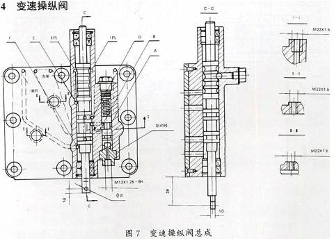 包括制動(dòng)安全閥和變速閥。見(jiàn)圖。閥體上的A孔通變速器組合閥。當(dāng)移動(dòng)變速滑閥時(shí),來(lái)自變矩組合閥的壓力油便可以分別流入孔D、E或F,(D通Ⅰ檔、E通Ⅱ檔、 F通倒檔)。閥體頂面上F點(diǎn)位置處Z1/8”螺孔為倒檔油壓輸出接口。
