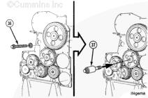 注: 用于較新的發(fā)動機上的軸上沒有使用拉拔器所需的螺紋。松開螺釘 (36),但不要全部拆下。