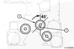 對準康明斯KTA柴油發(fā)動機凸輪軸惰輪軸 (2),以便使軸 (1) 的油道處于所示的垂直線的順時針45 度處。