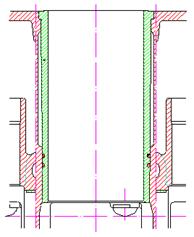 濕式缸套結(jié)構(gòu),缸套厚8.5mm。強度高,變形小,有利于降低機油耗;采用上止口定位,制造性能好;缸孔表面容易強化,耐磨性好,壽命長;維修性好;而且采用濕式缸套結(jié)構(gòu),氣缸體鑄造容易,廢品率低。