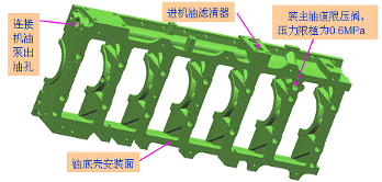 玉柴氣缸體-底面視圖:主油道通副油道的過渡由主軸承孔開槽來實現(xiàn),不必另外布置油道,結(jié)構(gòu)簡單。