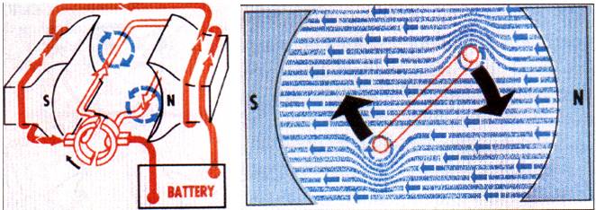 l 把電路環(huán)線置于兩磁極中。電流流向:蓄電池正→磁極線圈→ 碳刷→ 換向器→電路環(huán)線 → 換向器→碳刷 →蓄電池負(fù)