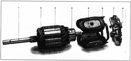 l 1、轉(zhuǎn)子軸 2、轉(zhuǎn)子線圈 3、轉(zhuǎn)子磁芯 4、換向器 5、磁極靴 6、磁場線圈 7、碳刷 8、碳刷架