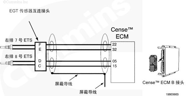 排氣溫度傳感器電路圖向 CENSE™ ECM 提供排氣溫度信號(hào)。排氣溫度傳感器為熱電偶。熱電偶是將兩種不同的金屬焊接起來構(gòu)成的。接合點(diǎn)隨溫度變化產(chǎn)生極小的電壓。