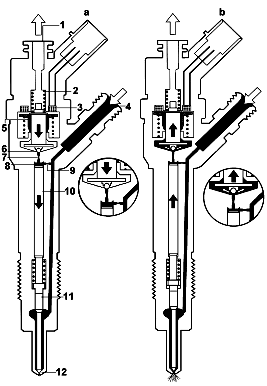 當(dāng)噴油器的電磁閥被觸發(fā),泄油孔被打開,這引起控制腔的壓力下降,結(jié)果,活塞上的液壓力也隨之下降,一旦液壓力降至低于作用于噴油嘴針閥承壓面上的力,針閥被打開,燃油經(jīng)噴孔噴入燃燒室。這種對噴油嘴針閥的不直接控制采用了一套液壓力放大系統(tǒng),因為快速打開針閥所需的力不能直接由電磁閥產(chǎn)生,所謂的打開針閥所需的控制作用,是通過電磁閥打開泄油孔使得控制腔壓力降低,從而打開針閥。