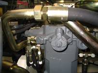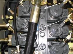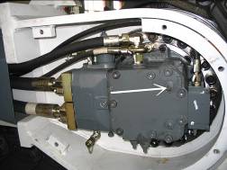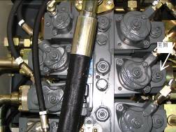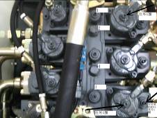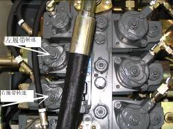 斷開回轉(zhuǎn)馬達制動油口,如下圖。在斷開的油管上接一測口,在斷開的馬達接頭處接堵頭。