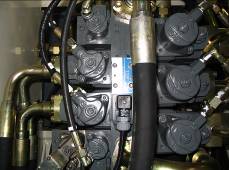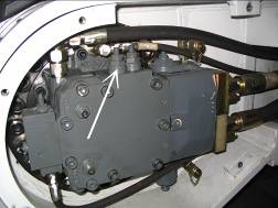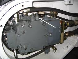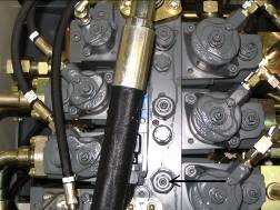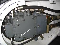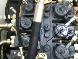 按下控制屏上“F3”鍵,快速回收鏟斗,讀出回油壓力,應(yīng)為90--100 bar,如果達不到,就調(diào)工作閥塊第二個黑六角螺釘,如下圖。