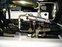 按下控制屏上“F3”鍵,和“兔子開關(guān)”按鈕,快速收回斗桿,讀出回油壓力,應(yīng)為110 bar,如果不對,就調(diào)斗桿油缸上的節(jié)流閥,使之達到目的100 bar
