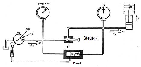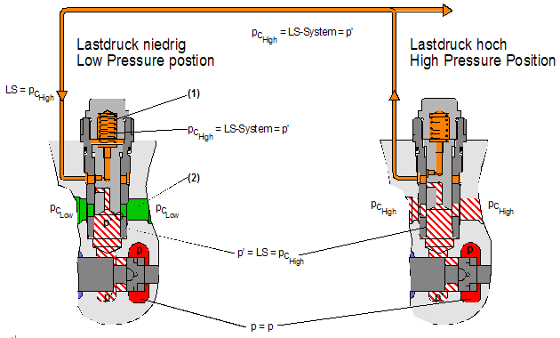 在單獨動作情況下或當(dāng)執(zhí)行機構(gòu)的負(fù)載壓力Pc在系統(tǒng)中處于最高,通過來自P‘通道的壓力補償閥的內(nèi)孔產(chǎn)生負(fù)載傳感(LS)壓力,并且反饋到泵控制器和帶有較低負(fù)載壓力的壓力補償閥部件。