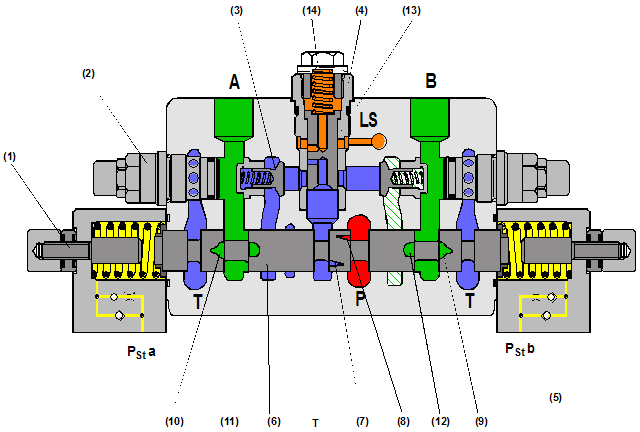 (1) 行程限制塊 (2)二次壓力釋放/防蝕閥 (3) 負(fù)載保持閥 (4) LUDV 壓力補償閥 (5) 先導(dǎo)梭閥 (6) 控制閥桿 (7) 輸入測流口 p ® A (8) 輸入測流口p ® B (9) 輸出測流口 B ® T (10) 輸出測流口 A ® T (11) 通道 pc ® A (12) 通道 pc ® B (13) 壓力補償控制閥桿 (14) 壓縮彈簧