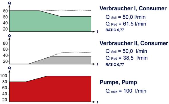 由于這個原因,即使在非飽和狀態(tài)下,LUDV系統(tǒng)內(nèi)負(fù)載壓力最高的執(zhí)行機構(gòu)也將不會陷入停頓狀態(tài),所有使用中的執(zhí)行機構(gòu)的速度根據(jù)開啟的通流面積按比例減小。