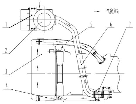 1-空濾支架 2-空氣過濾器 3-中冷器 4、5、6-進(jìn)氣管 7-渦輪增壓器