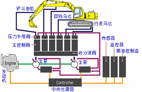 液壓挖掘機(jī)的動力裝置是由發(fā)動機(jī)、散熱器、連軸器及輔助元件組成。它主要是發(fā)動機(jī)和五大系統(tǒng)組成,如下圖所示: