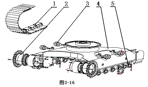 1-履帶;2-行走馬達(dá)及驅(qū)動輪;3-托鏈輪;4-X型車架;支重輪