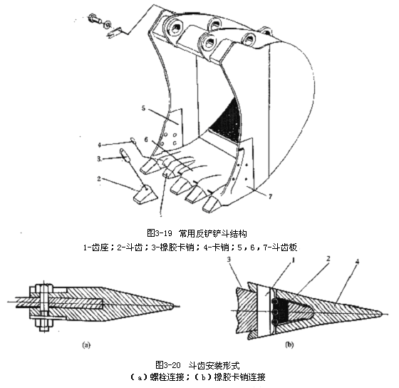 反鏟用的鏟斗形狀、尺寸與其作業(yè)對象有很大關(guān)系。為了滿足各種挖掘作業(yè)的需要,在同一臺挖掘機(jī)上可配以多種結(jié)構(gòu)型式的鏟斗,見圖3-19、圖3-20分別為反鏟用鏟斗的基本形式和常用形式。鏟斗的斗齒采用裝配式,其形式有橡膠卡銷式和螺栓連接式,如圖2-5所示。