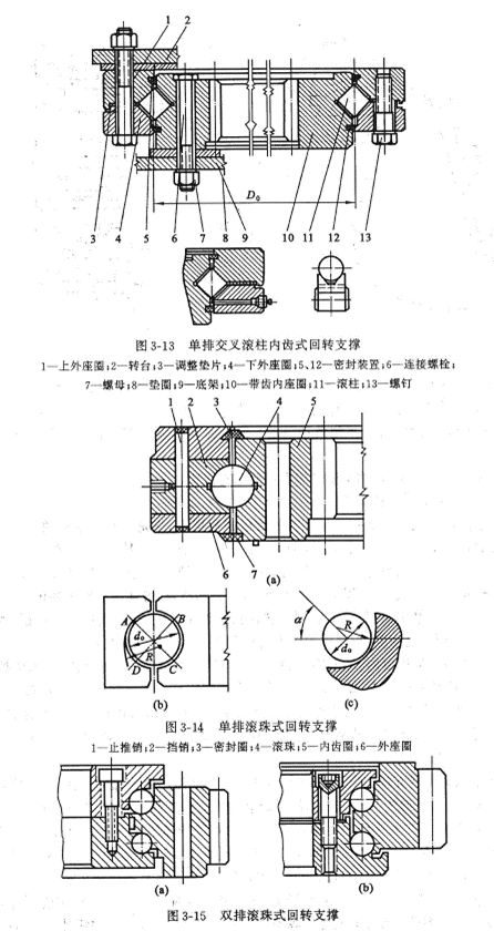 單斗液壓挖掘機(jī)用回轉(zhuǎn)支撐的結(jié)構(gòu)型式,實(shí)現(xiàn)上部平臺的回轉(zhuǎn),回轉(zhuǎn)支撐按結(jié)構(gòu)形式分為轉(zhuǎn)柱式和滾動軸承式等兩種,見圖3-13、圖3-14、圖3-15。