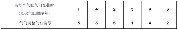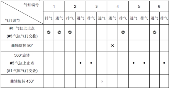 5) 當(dāng)5 號(hào)氣缸處于上止點(diǎn)時(shí),根據(jù)列表中“●”調(diào)整氣門間隙 。