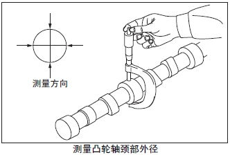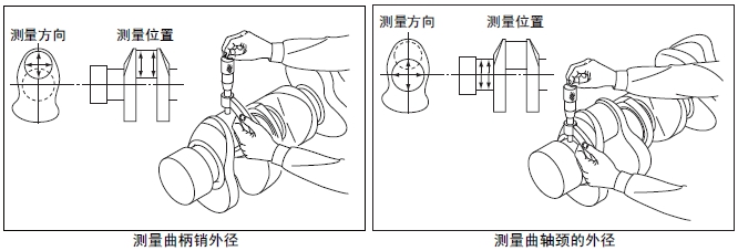 (1) 測(cè)量曲軸的曲柄銷和曲軸頸的外徑。超過(guò)極限值時(shí),使用減小尺寸的軸瓦,按照和減小尺寸軸瓦的規(guī)格研磨曲軸。使用-1.00 mm 規(guī)格的減小尺寸主軸瓦仍然超出極限值時(shí),更換新的曲軸。