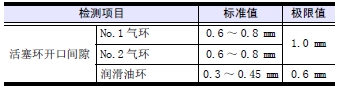 將活塞環(huán)放用標(biāo)準(zhǔn)量器或放在新的缸套內(nèi),測(cè)量開(kāi)口間隙。超過(guò)極限值時(shí),更換整套活塞環(huán)。