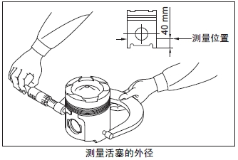測(cè)量與活塞銷成直角方向的活塞裙部。超過(guò)極限值時(shí)更換新活塞。