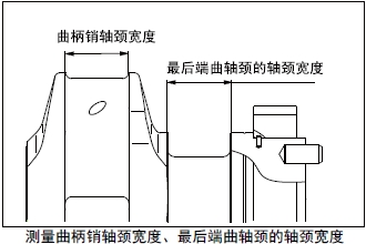 (2) 測(cè)量曲柄銷和最后端曲軸頸的軸頸寬度。根據(jù)最后端曲軸頸的軸頸寬度的磨損程度使用加大尺寸推力片時(shí),按照加大尺寸推力片的規(guī)格研磨曲軸。