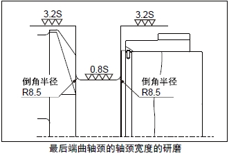 注意研磨時(shí)不要改變軸頸端部倒角的半徑和軸頸寬度。對(duì)于表面硬度明顯降低的曲軸,要再進(jìn)行熱處理并進(jìn)行磁性探傷檢查。研磨加工后,測(cè)量曲柄銷軸頸寬度和最后端曲軸頸的軸頸寬度。
