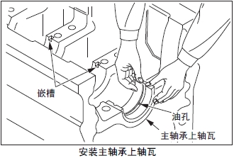 (3) 主軸承上軸瓦對準(zhǔn)曲軸箱的嵌槽后安裝。