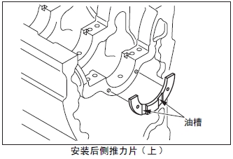 (1) 后側(cè)推力片( 上)的油槽面朝發(fā)動(dòng)機(jī)后側(cè),對準(zhǔn)曲軸箱最后端的定位銷位置后安裝。