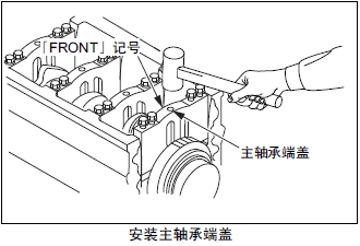 (2) 安裝時(shí),主軸承端蓋上的刻印編號(hào)按發(fā)動(dòng)機(jī)前側(cè)向后側(cè)的順序,另外,端蓋「FRONT」記號(hào)浮刻的側(cè)面朝向發(fā)動(dòng)機(jī)前側(cè)的方向( 嵌槽都在同側(cè))。