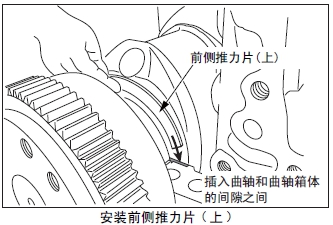 (2) 前側(cè)推力片( 上)的油槽面朝發(fā)動(dòng)機(jī)的前側(cè),在曲軸和曲軸箱的空隙之間插入前側(cè)推力片( 上)。