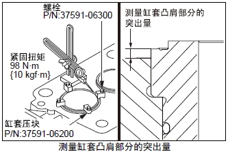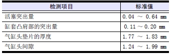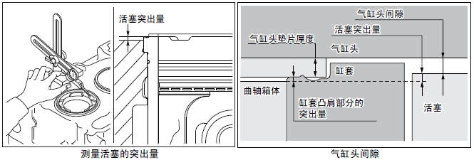 注: 從活塞突出量、缸套凸肩部的突出量、氣缸墊片的厚度,可判斷氣缸頭間隙(活塞頂部和氣缸頭之間的間隙)。氣缸頭間隙=氣缸頭墊片的厚度+ 缸套凸肩部的突出量-活塞突出量