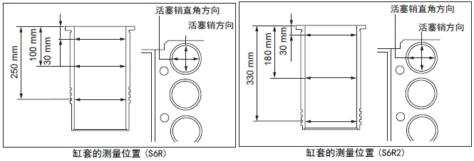 2.5 測量三菱發(fā)動(dòng)機(jī)缸套的內(nèi)徑選擇缸套內(nèi)側(cè)的上部( 上死點(diǎn)時(shí)No.1 氣環(huán)的位置)、中間部分和O形圈插入部分,沿活塞銷方向及其直角方向,測量缸套的內(nèi)徑。超過極限值時(shí)更換新的缸套。發(fā)生變形時(shí)重新安裝。