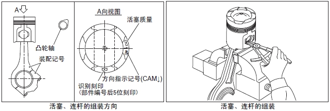 (1) 活塞銷涂抹潤滑油后插入,將活塞和連桿組裝在一起?;钊瓦B桿的組裝方向如圖所示。